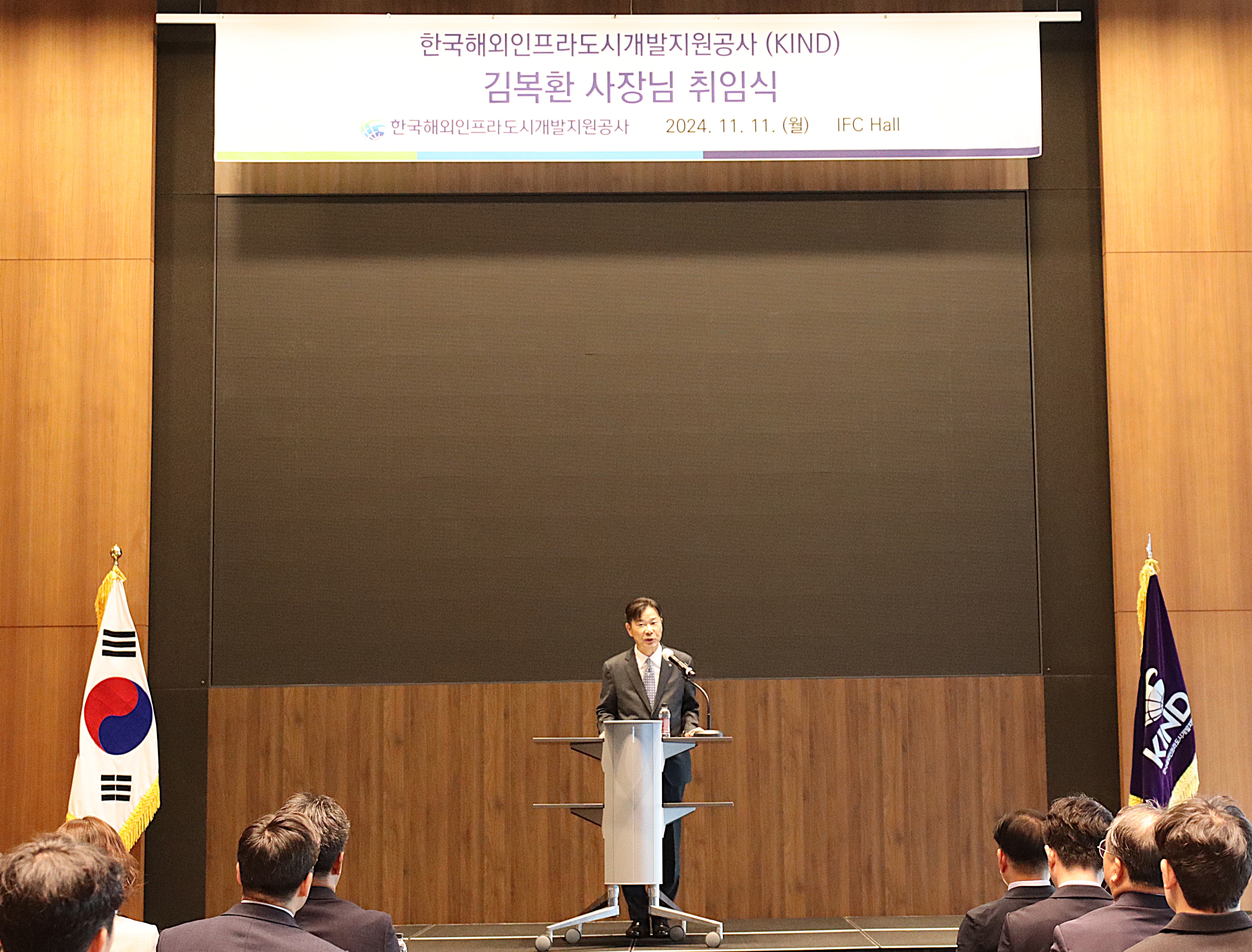 한국해외인프라도시개발지원공사(이하 KIND, 사장 김복환) 김복환제3대 신임 사장이 11일 공식 취임했다. 김복환 신임 사장은 이날 오후 열린 취임식을 통해 직원들과 첫 만남을 가졌다.