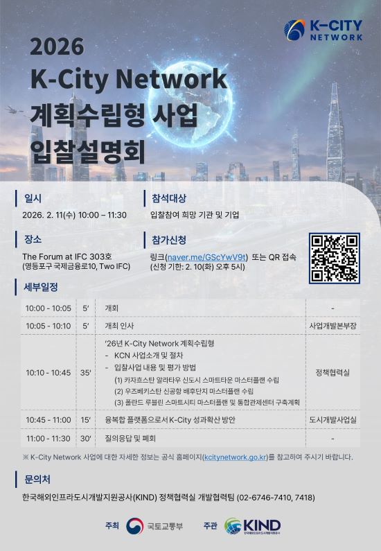 한국해외인프라도시개발지원공사(KIND)는 「2026년 K-City Network 계획수립형 사업 입찰설명회」를 아래와 같이 개최하여,
