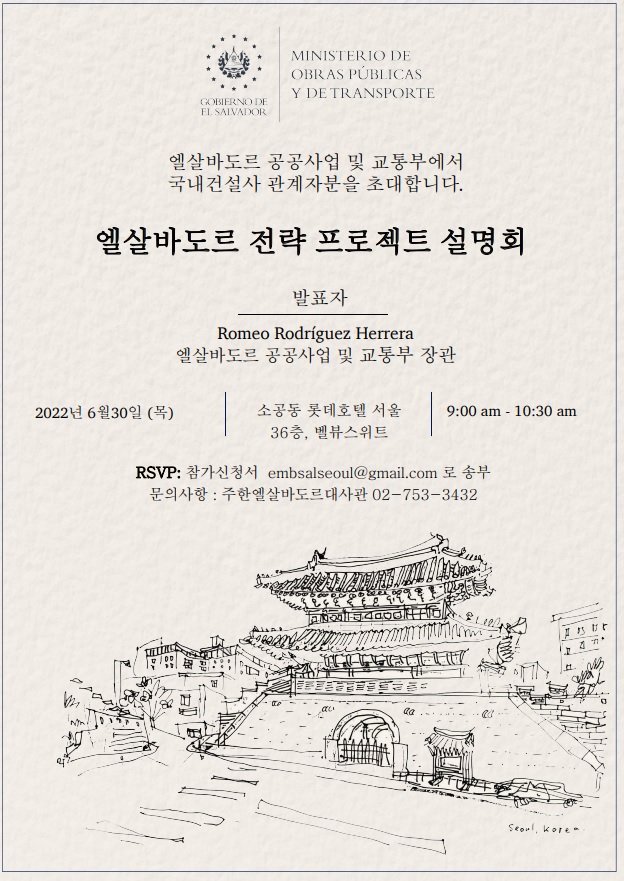 엘살바도르 공공사업 및 교통부에서 엘살바도르 전략 프로젝트 설명회를 개최하기여 아래와 같이 안내드립니다.
