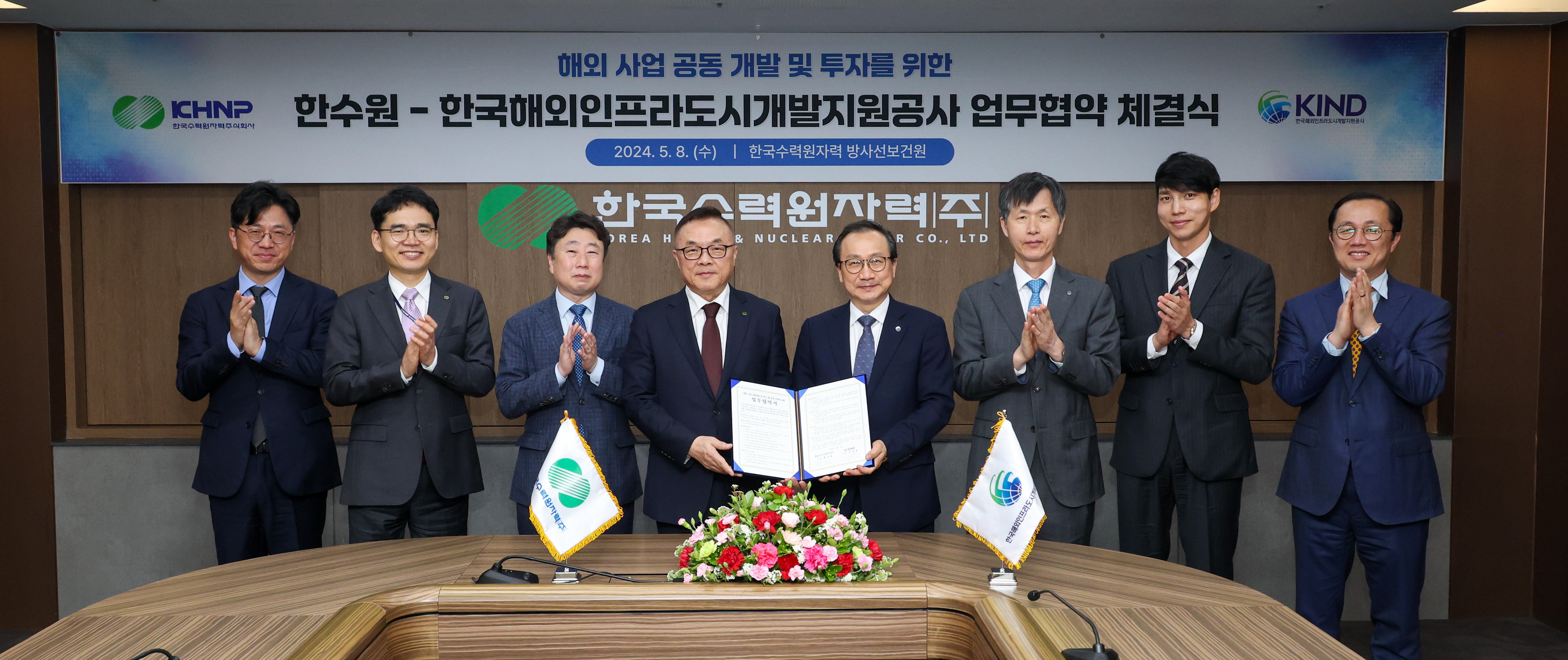 5월 8일 서울 중구에 소재한 한수원 서울사무소에서 KIND 이강훈 사장과 한수원 황주호 사장, 그리고 양사 임직원이 참석한 가운데 해외사업 공동개발 및 투자를 위한 전략적 제휴 업무협약 체결식이 개최되었다.